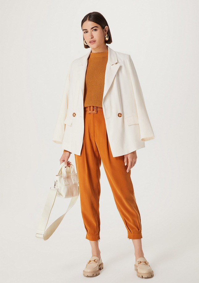 Calça Feminina confeccionada em tecido plano de viscose e poliéster. Conta com modelagem alfaiataria estilo jogger com passantes, botão e zíper.