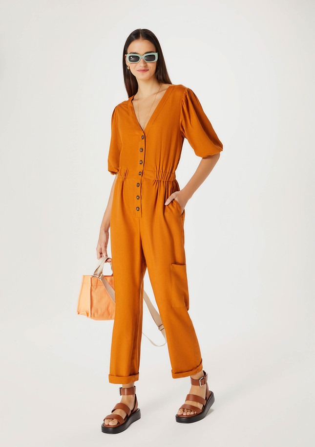 Macacão Feminino Reto Em Linho. Elaborado em tecido plano de linho e viscose. Conta com mangas curtas bufantes, decote v, vista de botões, elástico na cintura, bolsos faca frontais e bolsos retangulares na altura do joelho. Modelagem reta, levemente solto do corpo, acinturando na cintura.