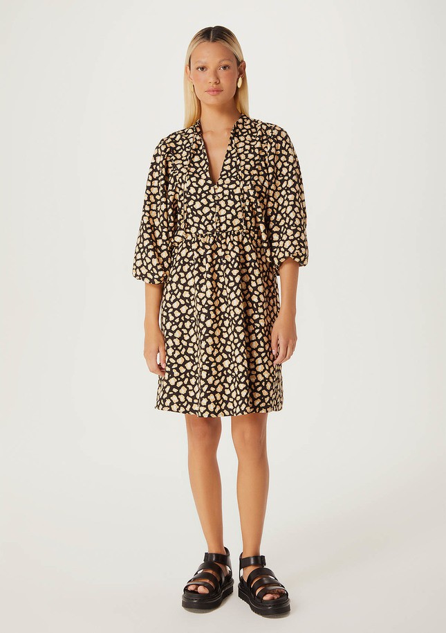 Vestido confeccionado em tecido plano 100% viscose estampado. Conta com modelagem evasê, comprimento curto, com manga bufante 3/4, decote v, com shape solto ao corpo.;