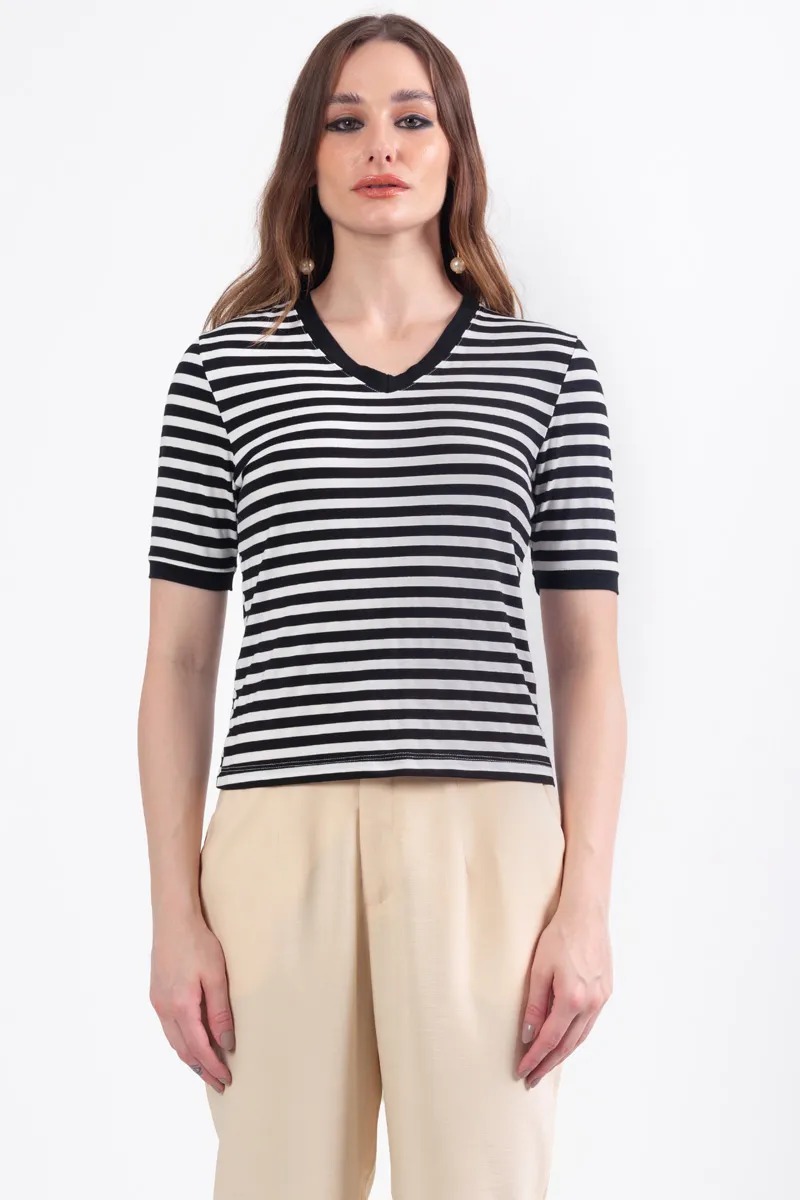 As listras são clássicas! E por ser clássico é uma peça obrigatória no guarda-roupas. A blusa modelo t-shirt de listras é leve e o match preto e branco é perfeito, permitindo composições de looks clássicos ou fashionistas. Tanto decote em V quanto barras das mangas, são finalizados com filetes de tecido preto, criando um acabamento visivelmente único. As listras são casadas para um acabamento mais sofisticado.