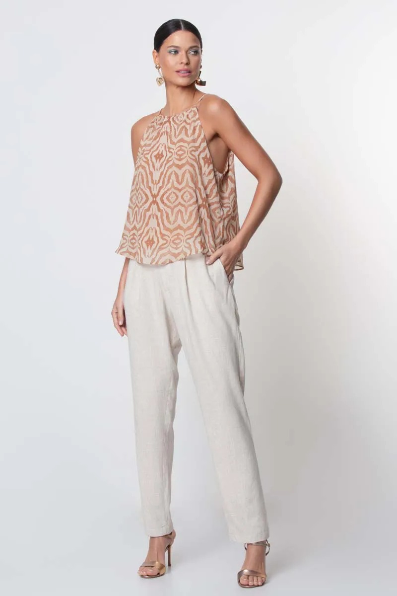 Blusa de alça fina de Chiffon, peça com forro, cordinha para formar laço e ajustar a alça nas costas. Detalhe de recorte de gota nas costas.