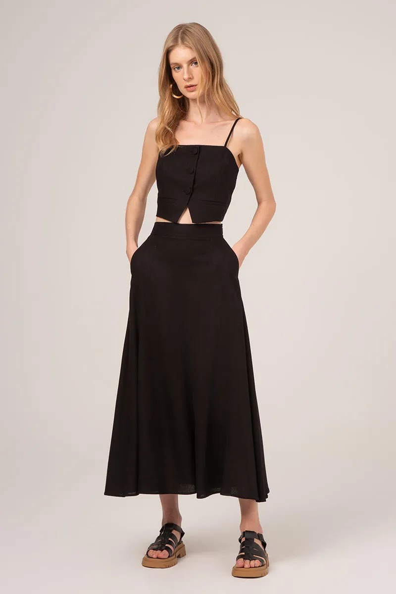 Saia maxi em viscolinho é perfeita para um visual sofisticado e fluído. Confeccionada em viscolinho de alta qualidade, a saia oferece um caimento suave e confortável. O cós com pesponto e o zíper semi invisível garantem um acabamento refinado e prático. Os bolsos faca adicionam funcionalidade, enquanto os recortes com pesponto trazem um toque de estilo e estrutura à peça. A saia fluída proporciona movimento e conforto, tornando-a ideal para composições casuais ou mais sofisticadas. Perfeita para quem busca um design elegante e cheio de personalidade.