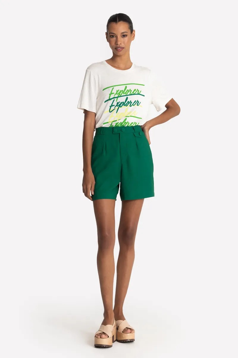 T-shirt confeccionada em viscolycra com linho. A peça possui manga curta, estampa frontal e decote redondo. A peça tem uma estampa exclusiva na frente, com a frase em inglês: ?Explorer?. Sua tradução é: ?Exploradora? As tees continuam em alta nessa estação, criando looks despojados!