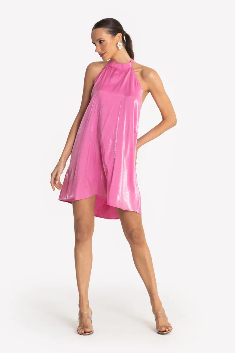 Vestido curto frente única, com cavas americanas na frente, e faixa alongada no decote para amarração no pescoço. Peça fluida e soltinha ao corpo. Confeccionado em tecido de alfaiataria com brilho acetinado, é uma peça perfeita para combinar com sandálias de salto e criar um visual super charmoso.