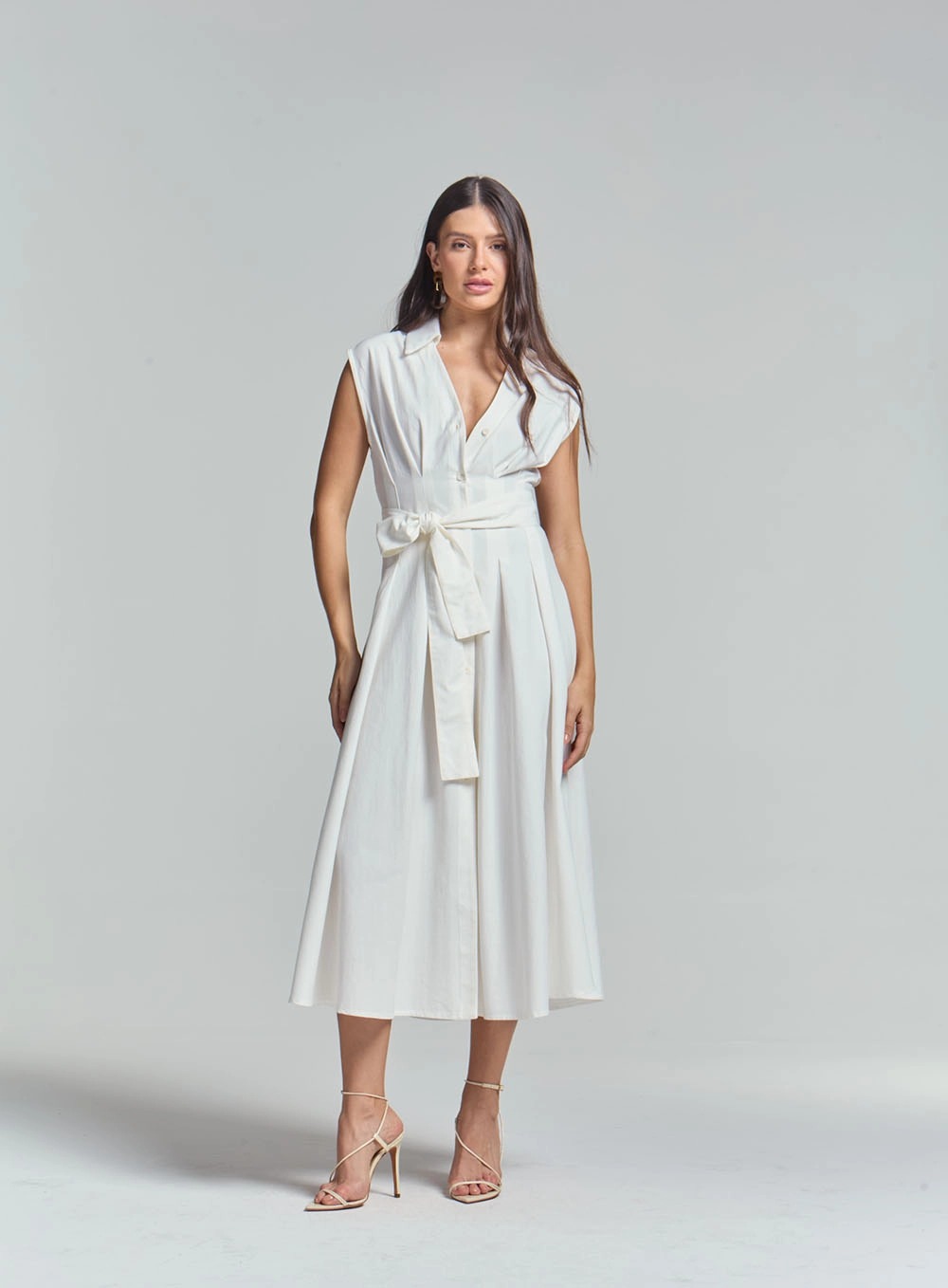 Design: Sem mangas, gola clássica, fechamento frontal com botões, faixa para amarração na cintura, comprimento midi